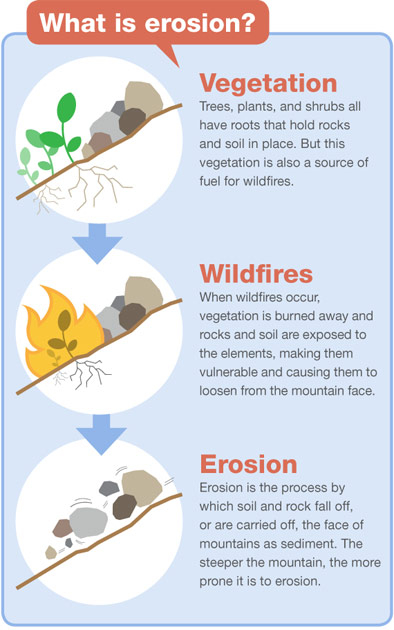 The Los Angeles region is unique because steep, easily erodible mountains are located close to the coast. Erosion occurs when loose soil, rocks, and debris—collectively called “sediment”—are carried downstream, typically during rainfall events. Although Los Angeles receives rain periodically, when storms do occur, they can be intense and produce significant runoff.