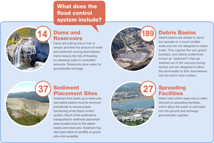 The District manages a flood control system of dams, debris basins, and other drainage infrastructure, which reduces risk of floods and debris flows for downstream communities. Effective sediment management requires the regular removal of sediment that deposits within District facilities.