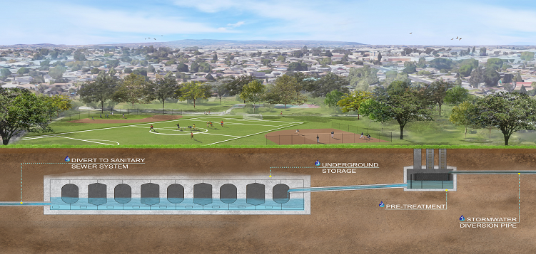Captured stormwater runoff will be diverted into a nearby sanitary sewer system for further treatment downstream and future reuse.