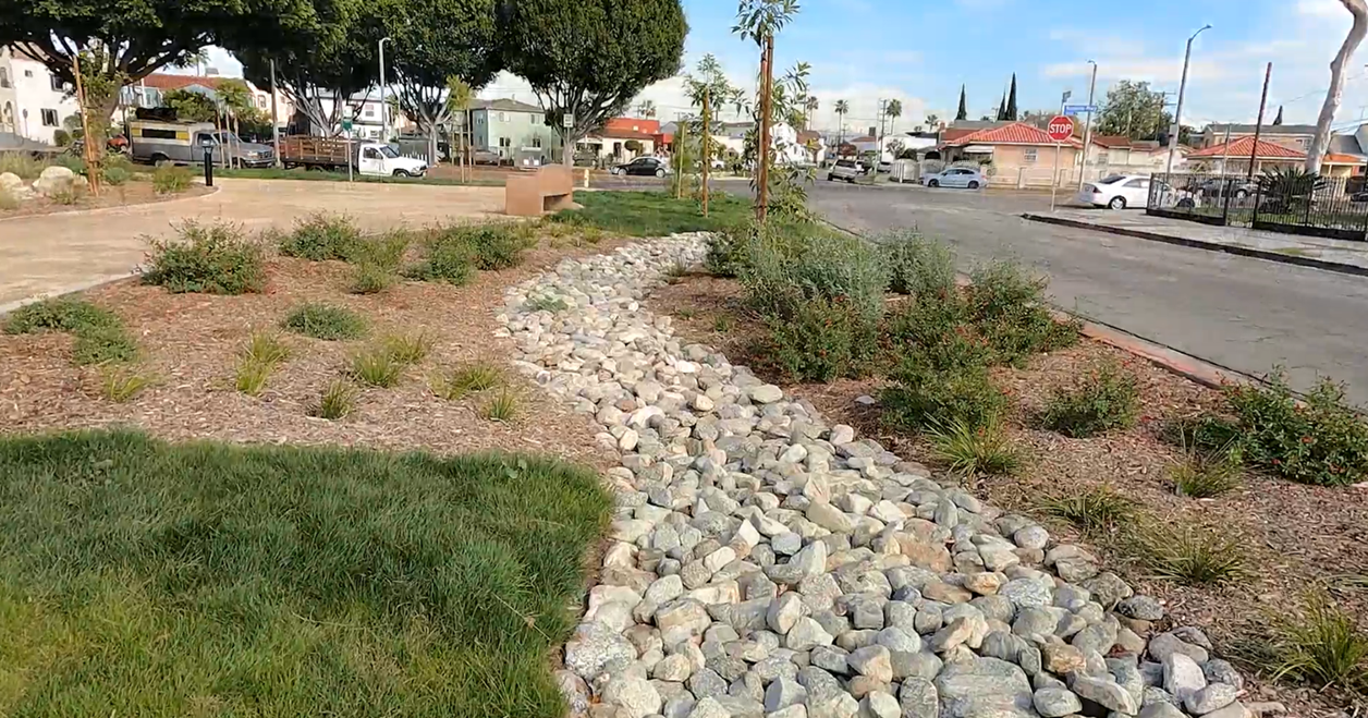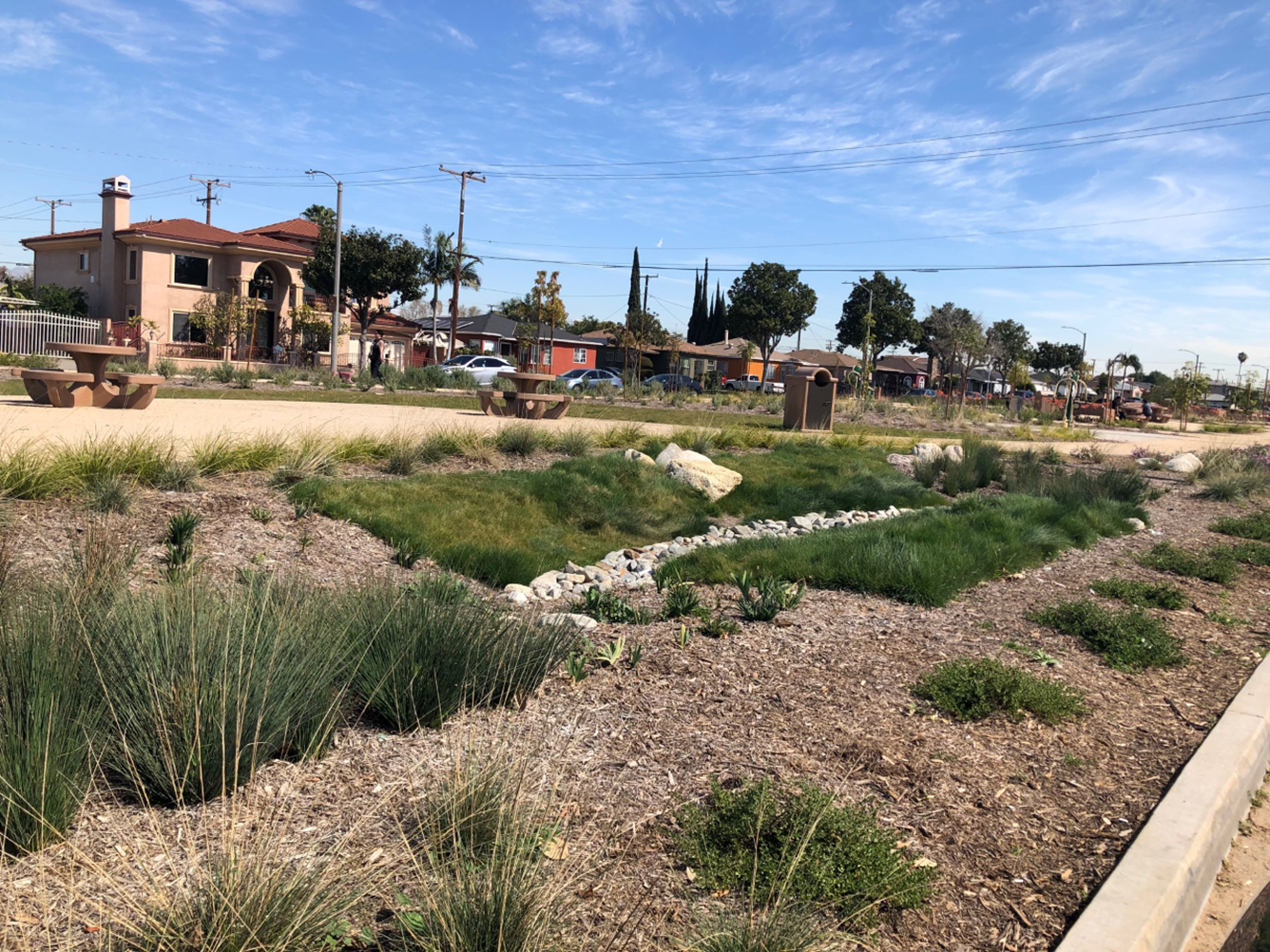 The East Los Angeles Sustainable Median Stormwater Capture Project (Project) is located in the unincorporated area of East Los Angeles (East LA), in Landscape Maintenance District Zone 35, and improves water quality, increases water supply, and enhances recreation and the community. This Project captures and infiltrates approximately 21 acre-feet of urban and stormwater runoff from a 3,000-acre tributary area of mostly residential and commercial land areas. The project also provides above ground improvements such as jogging paths, drought tolerant landscaping, plant over 300 trees, and educational signage.