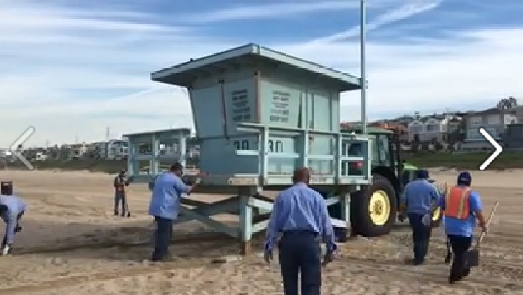 Lifeguard towers, beach fire pits, and trash barrels are moved to a safer distance farther from the shoreline.