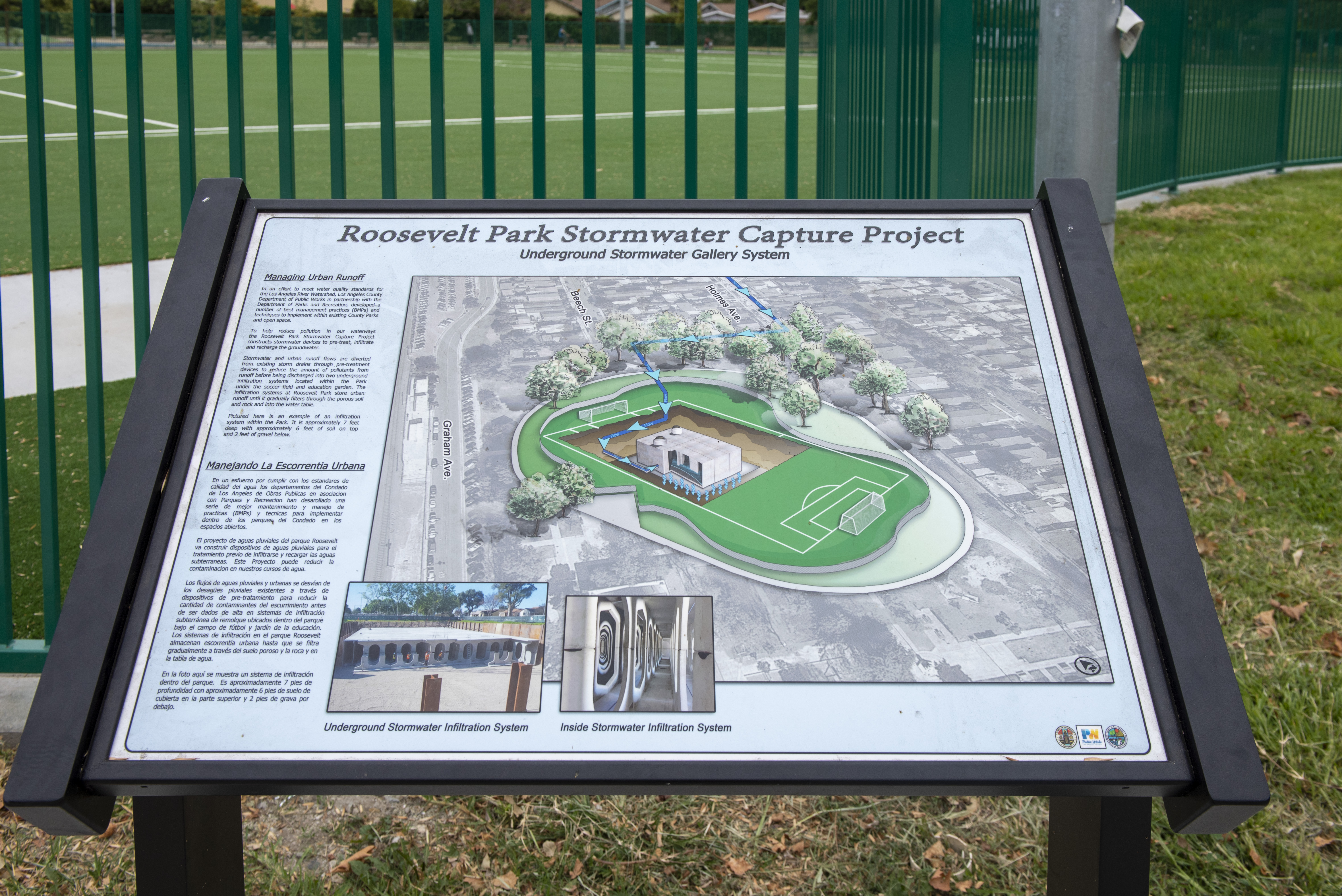 The proposed Franklin D. Roosevelt Park Regional Stormwater Capture Project is a County of Los Angeles Department of Public Works (LACDPW) project that proposes several improvements to the Park to increase water conservation, improve water quality, and provide additional recreation, education, and outreach benefits to Park visitors. The Park encompasses approximately 24 acres and lies adjacent to the Glen Avenue Drainage System that discharges into Compton Creek, which is a tributary of the Los Angeles River, both of which are water quality impaired. LACDPW is proposing to divert dry- and wet-weather flows from the Glen Avenue Drainage System and to provide pre-treatment of water for infiltration to the groundwater basin. The proposed project would achieve multiple benefits, including water quality improvements, water conservation, Park facility upgrades, and education and outreach signage.